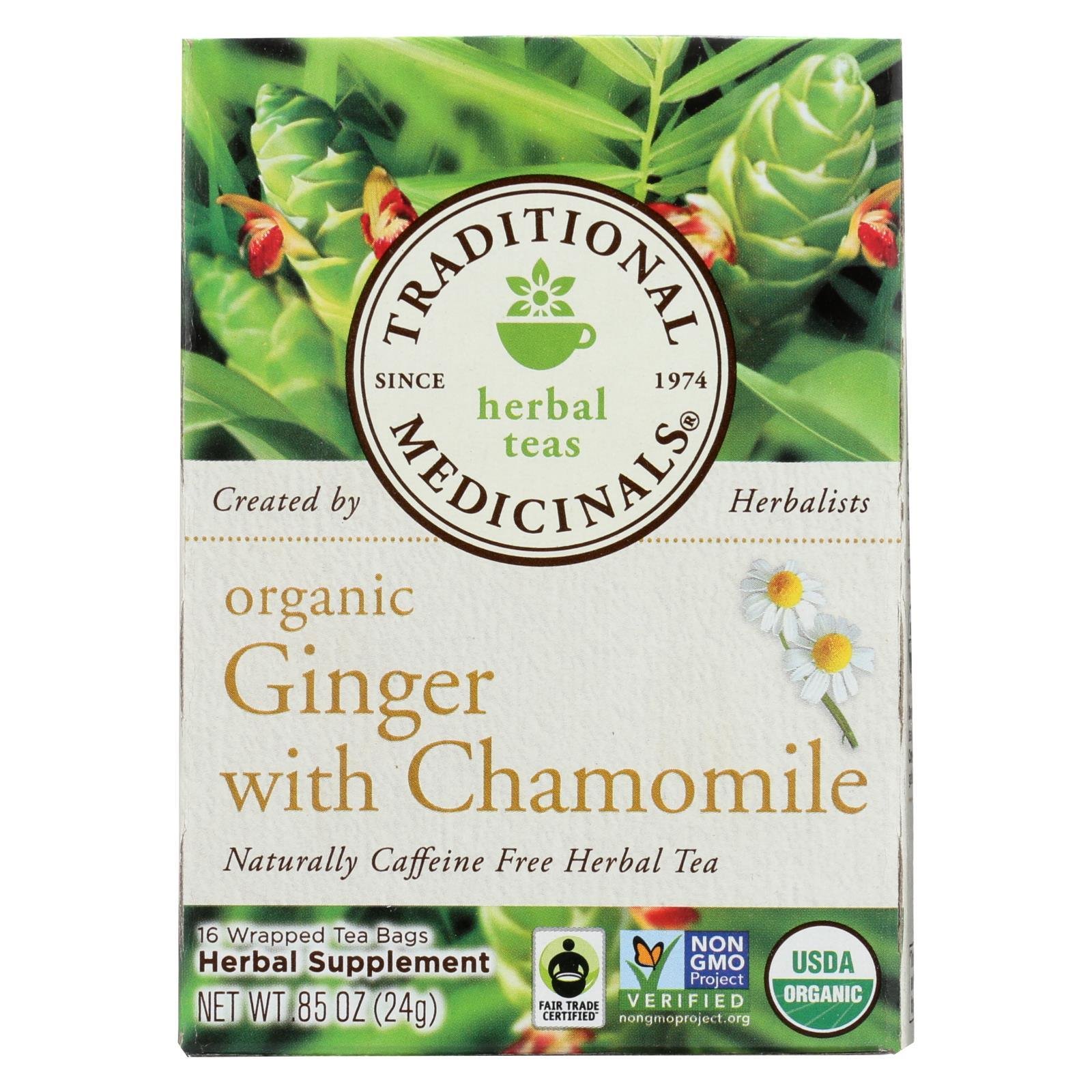 Traditional medicinals' ginger with chamomile tea bags bagged tea is made with certified usda organic and verified non-gmo ingredients. Each box contains 16 tea bags of our naturally caffeine free herbal tea. Chamomile flower and ginger are widely used to soothe the digestion. See label for warnings and risks.